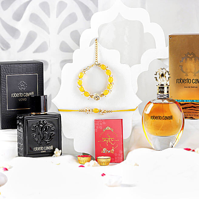 Sunkissed Stone Work Lumba Pearl Rakhi & Fragrance Duo