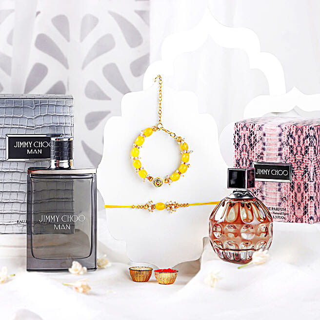 Sunkissed Stone Work Lumba Pearl Rakhi & Perfume Set