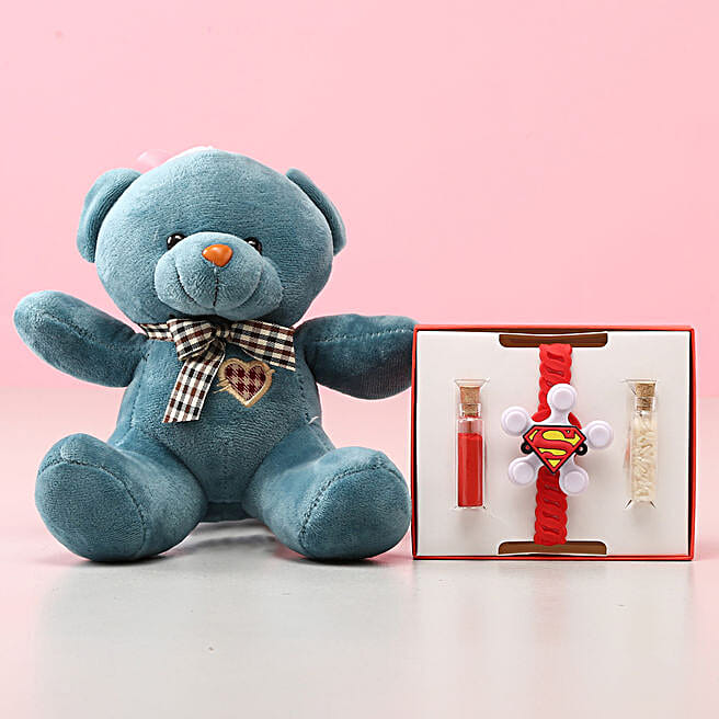 Superman Kids Rakhi With Green Teddy Bear