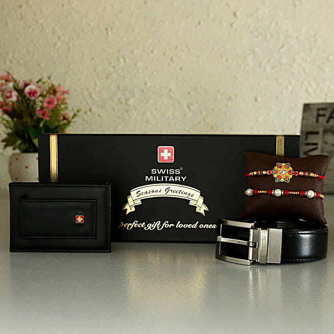 Swiss Military Belt & Wallet Combo With Two Rakhis