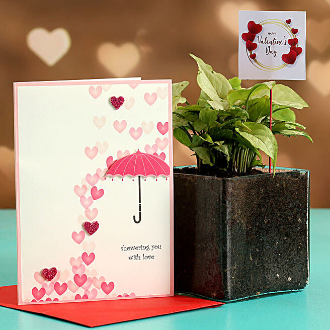 Syngonium Plant In Glass Vase With V-Day Tag & Greeting Card