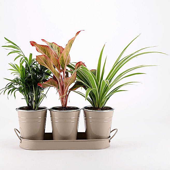 Three Air Purifying Plants in Beige Metal Pots