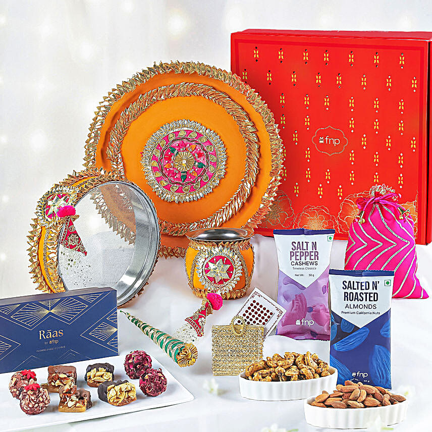 Experience the joy of Karwa Chauth with a thoughtfully curated gift hamper, designed to honour the sacred bond between couples. This elegant collection features a traditional thali, steel kalash, and channi, perfect for the rituals. Delight in our FNP salt pepper cashews, roasted salted almonds, and delectable fusion sweets. Enhanced with a decorative bindi, mehendi lcone, and sindoor pouch, this hamper is a heartfelt gift for any devoted wife, reflecting love and tradition.