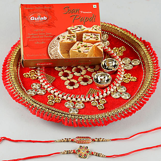 Two Meenakari Rakhis With Pooja Thali & Soan Papdi
