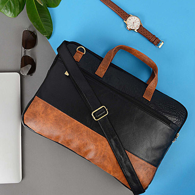 Vivinkaa Black & Tan Leather Unisex Laptop Bag