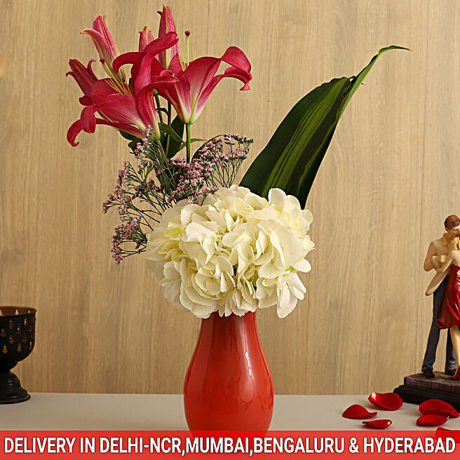 White Hydrangea & Pink Lilies In Peach Glass Vase