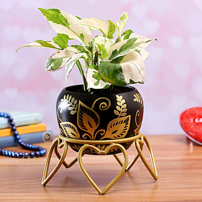 White Pothos Plant In Black & Gold Hand Printed Stylish Pot