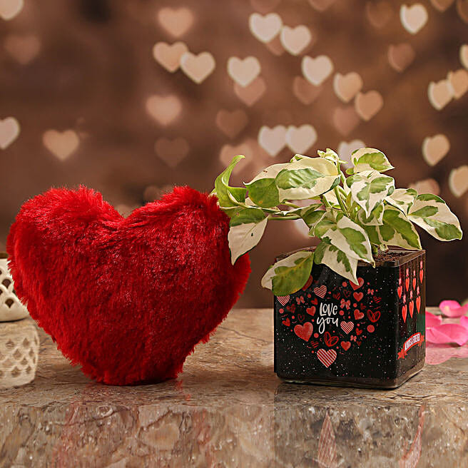 White Pothos Plant In Love You Vase & Red Heart