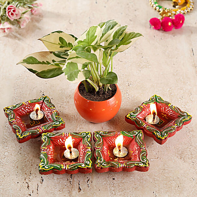 White Pothos Plant & Orange Hand Painted Diyas