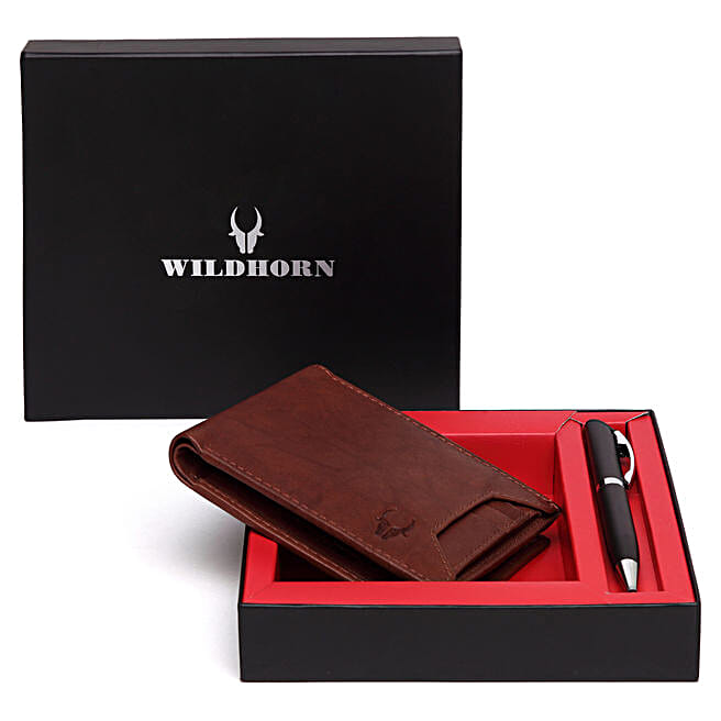 WildHorn RFID Protected Brown Mens Wallet and Pen