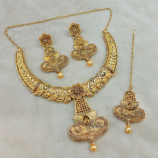 Women Austrian Stone Necklace Set with Maang Tikka