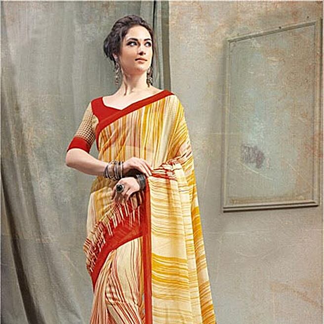 Yellow Chiffon Stripes Printed Saree