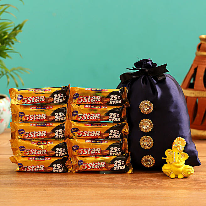 Yellow Flute Ganesha Idol & 5 Star In Purple Potli