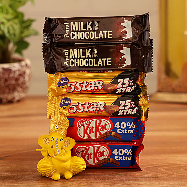 Yellow Flute Ganesha Idol & Chocolates Combo