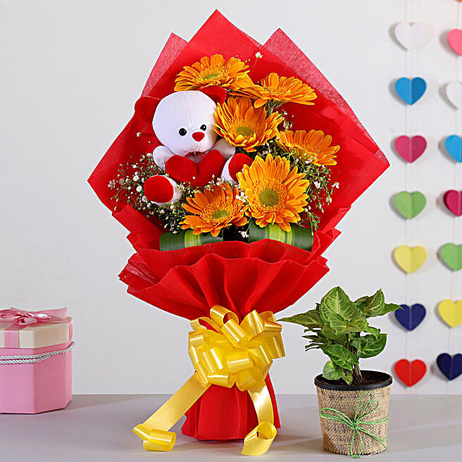 Yellow Gerberas Bouquet With Syngonium Plant & Teddy