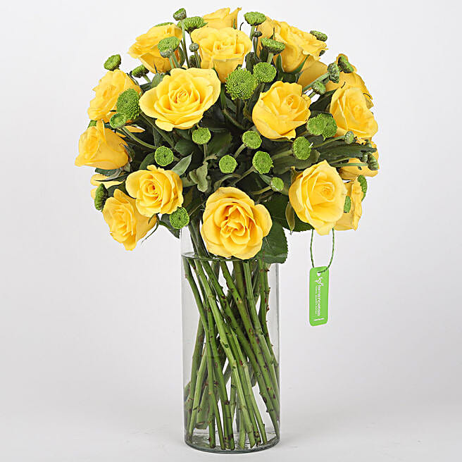 Yellow Roses & Green Daisies Cylindrical Vase