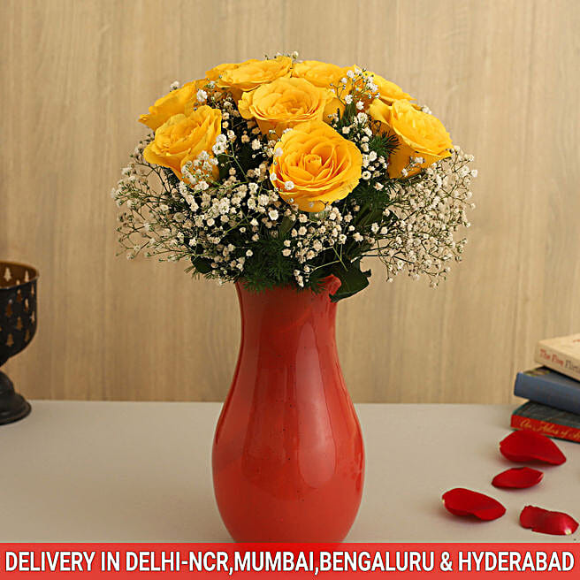 Yellow Roses & White Gypsophila In Peach Glass Vase