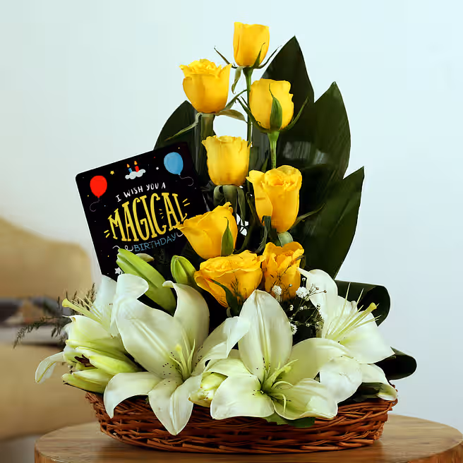 Yellow Roses & White Lilies Basket & Birthday Table Top