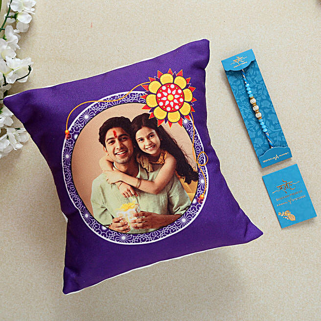 Sea Blue Pearl Rakhi And Personalised Cushion