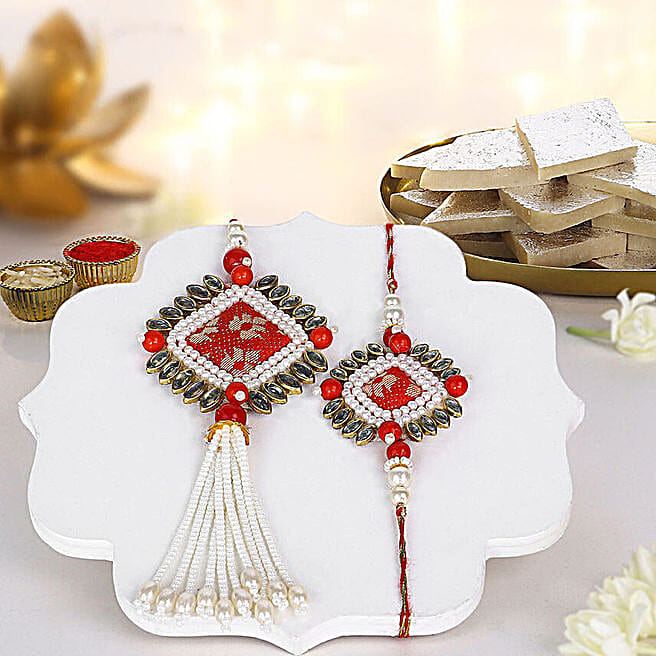 Bandhani Bhaiya-Bhabhi Rakhi Set & Kaju Roll Delight