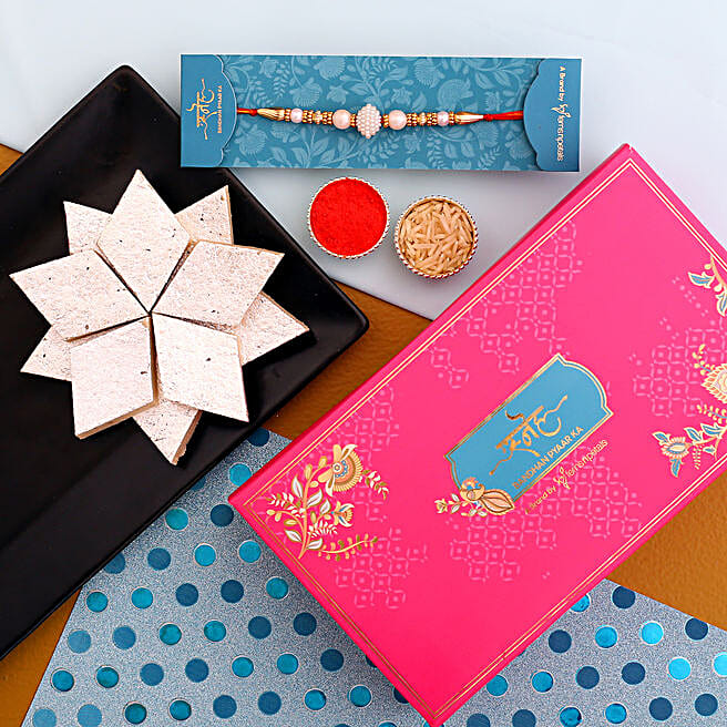 Elegant Pearl And Mauli Rakhi With 250 GMs Kaju Katli