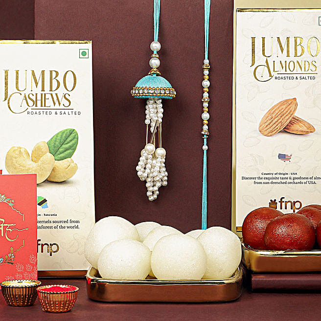Tranquil Teal Jhumar Bhaiya-Bhabhi Pearl Rakhi Set & Sweet Treats