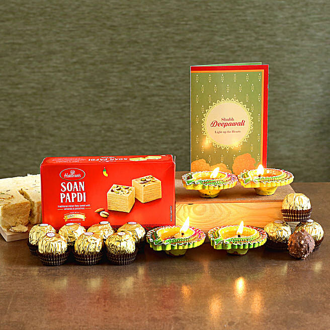 Designer Diyas With Soan Papdi And Chocolates N Greeting Card