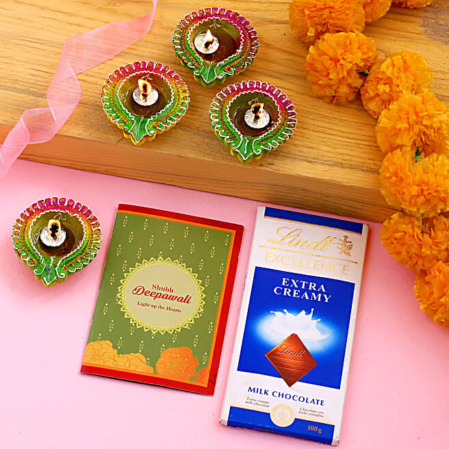 Diwali Special Floral Diyas With Greeting Card And Lindt