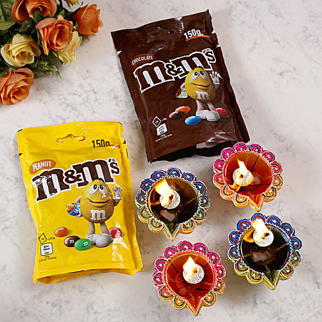Set Of 4 Designer Diyas And Mandm Chocolates