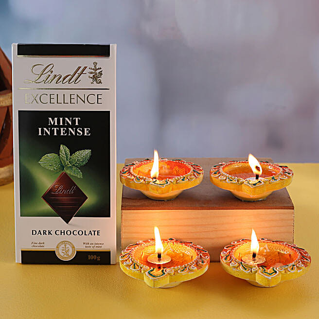 Set Of 4 Traditional Diyas And Lindt Mint Intense Dark