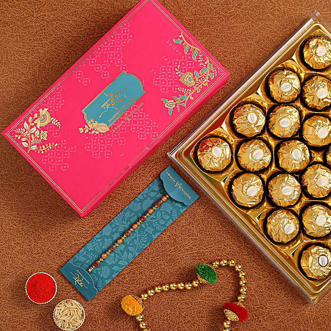 Traditional Golden Pearl Rakhi And 16 Pcs Ferrero Rocher