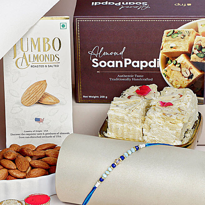 Cerulean Blue Simple Dhaga Rakhi Sweets and Nuts combo