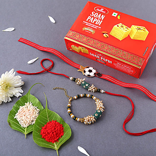 Sneh Pearl Family Rakhi Set & Soan Papdi