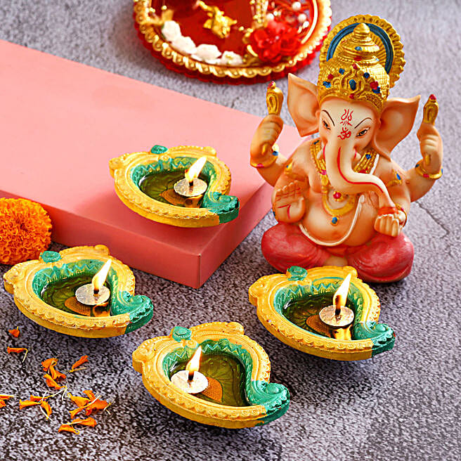 4 Mango Shaped Diyas and Pink Dhoti Ganesha Idol