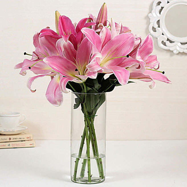 5 Pink Oriental Lilies in Glass Vase