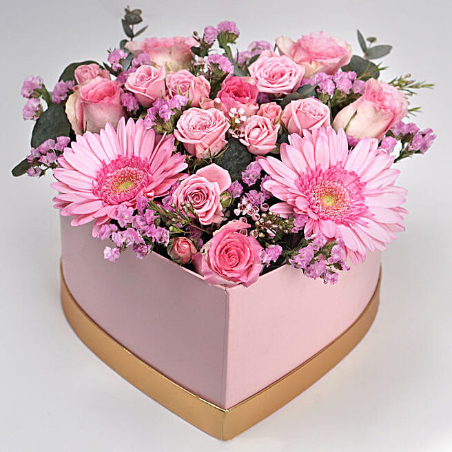 Blissful Mixed Flowers Pink Heart Shaped Box