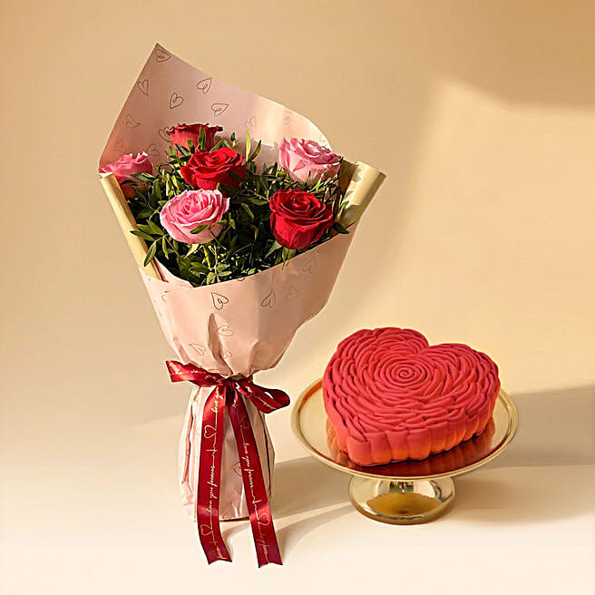 Pink & Red Sweet Roses Bouquet With Chocolate Cake