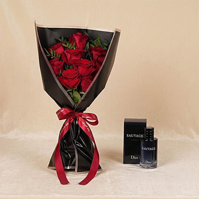 red rose bouquet with sauvage perfume for men