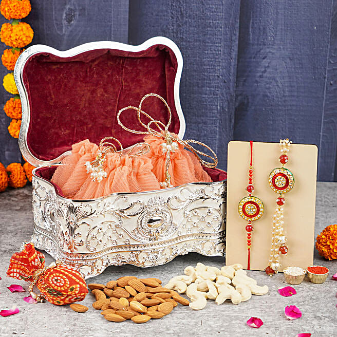 Shubh Sargam Bhaiya Bhabhi Rakhis & Dryfruits Silver Box