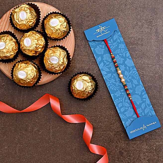 Traditional Pearl Studded Mauli Rakhi With 5 ferrero Rocher