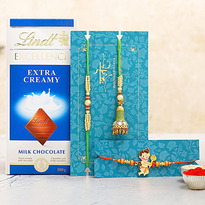 Bal Hanuman And Green Lumba Rakhi Set With Lindt