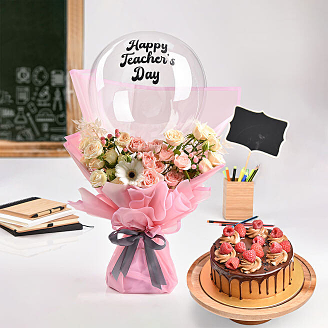 Happy Teachers Day Bouquet With Balloon And Cake