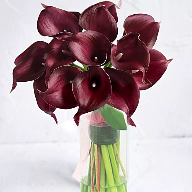 Heavenly Maroon Calla Lilies Glass Vase