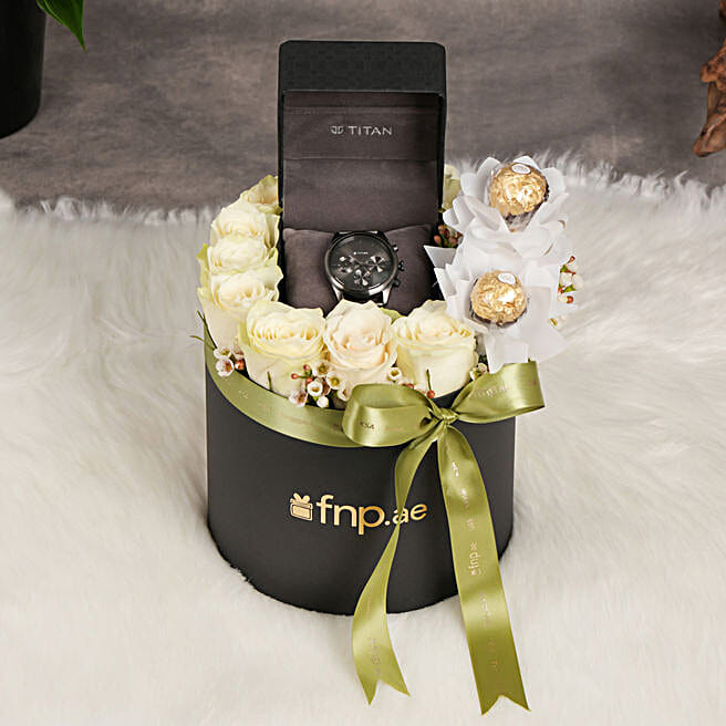 Titan Quartz Analog Watch for Men Exquisitely Gift Boxed With White Rose N Chocolate