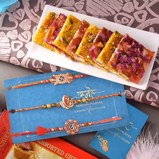 Set Of 3 Traditional Rakhis And Assorted Chikki