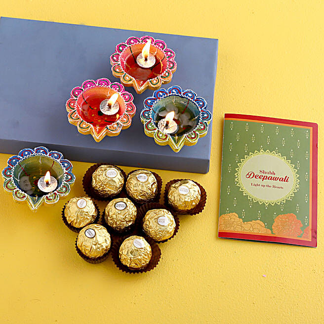 Decorative Diyas With Greeting Card And Ferrero Rocher