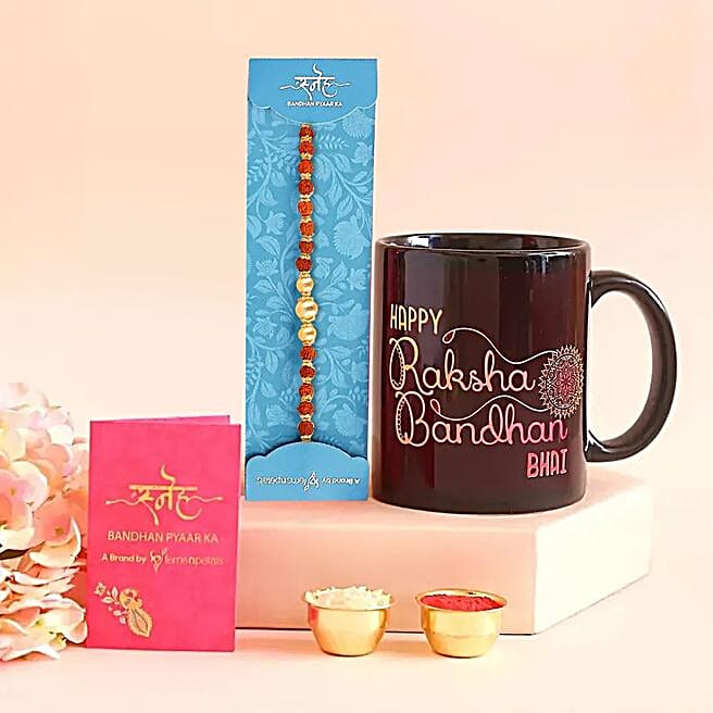 Gold Beads Rudraksha Rakhi Strand and Mug combo