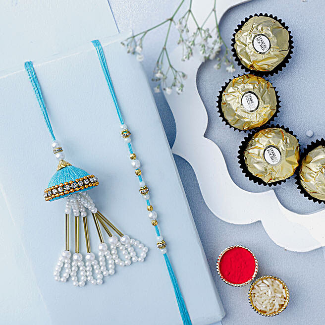 Tranquil Teal Jhumar Lumba Pearl Rakhi Set N Ferrero Indulgence